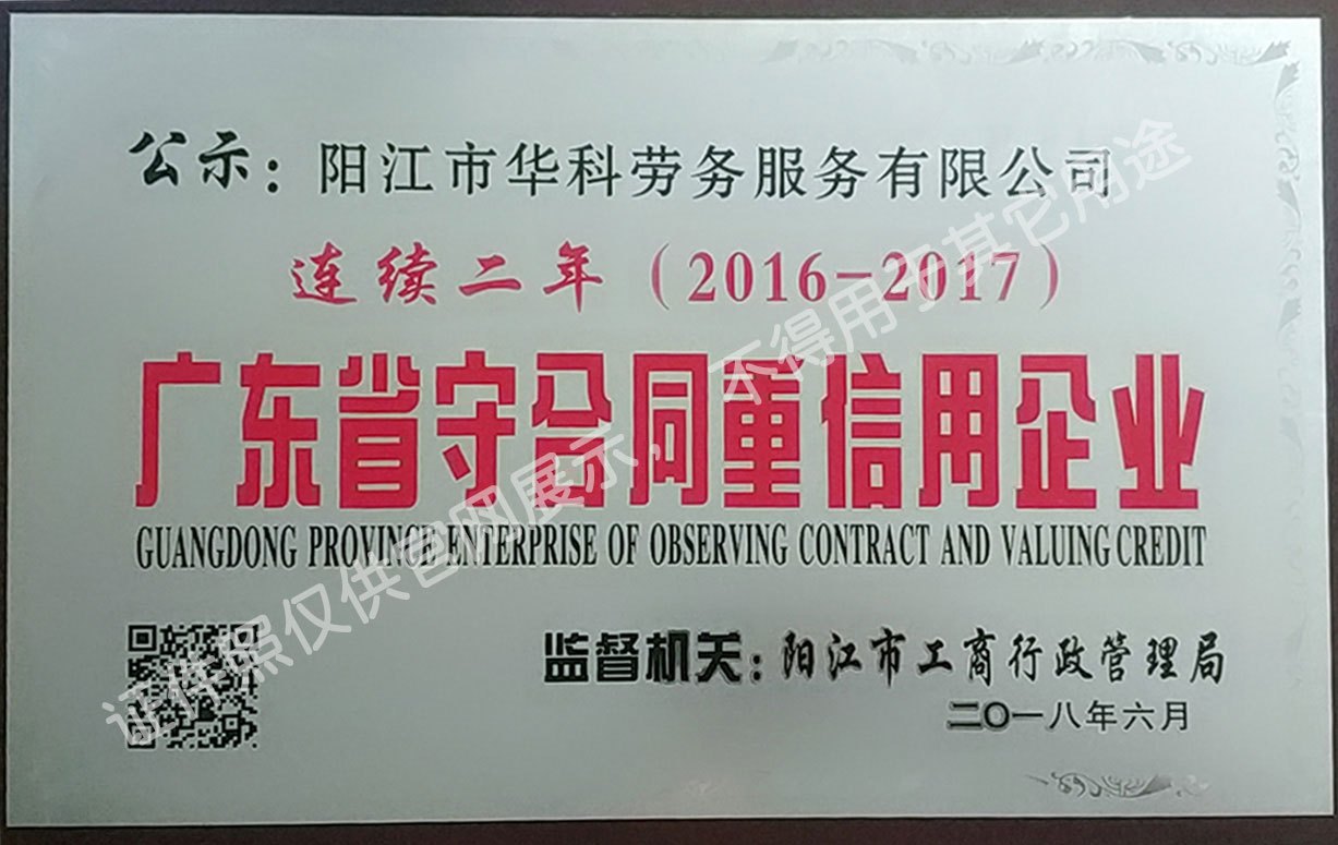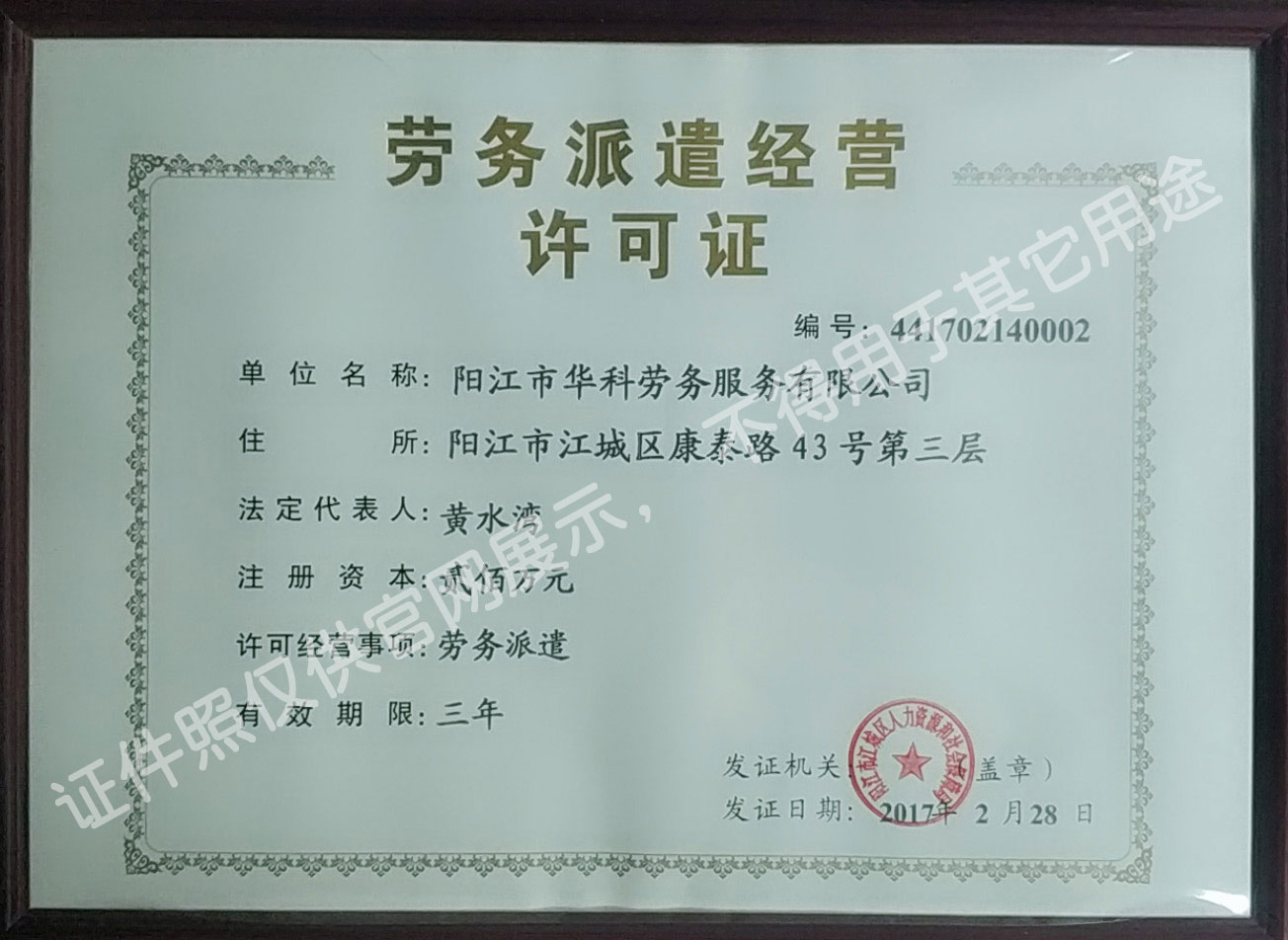 華科勞務服務有限公司是專業(yè)從事人事代理、勞務租賃、人力派遣及管理的綜合性服務機構,是首批獲得廣東省人力資源廳、陽江市勞動和社會保障局頒發(fā)人力資源許可證的合法單位。公司秉承“誠信務實、專業(yè)熱情、滿意第一、服務社群”的經(jīng)營理念,在勞務派遣業(yè)務的基礎上,更致力于合同制工人(臨時工、實習生、假期工)方向發(fā)展,為用工企業(yè)及時輸送合格的各類人才,合理調(diào)配人力資源的有序流動,幫助求職者尋求更加滿意的就業(yè)渠道和崗位,切實維護求職者的合法權益。
